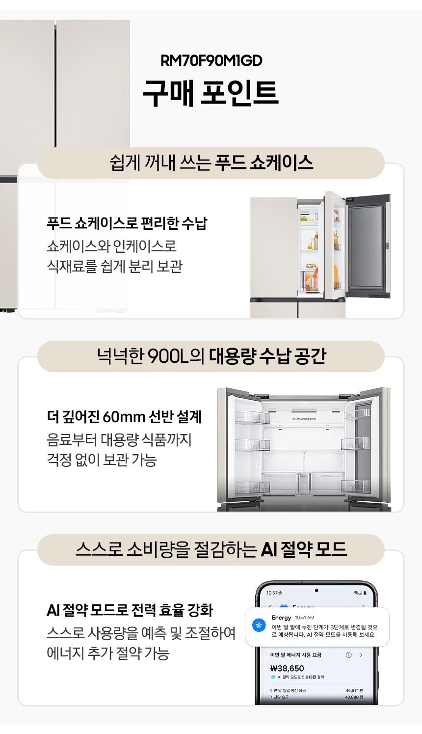 삼성 비스포크 AI 냉장고 902L RM70F90M1GD 4도어 프리스탠딩 양문형 냉장고 홈바 대용량 1등급 에너지 효율